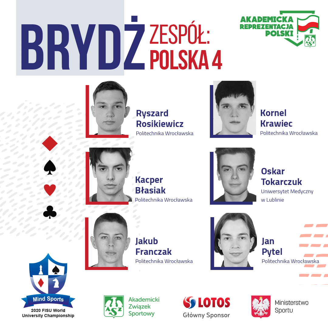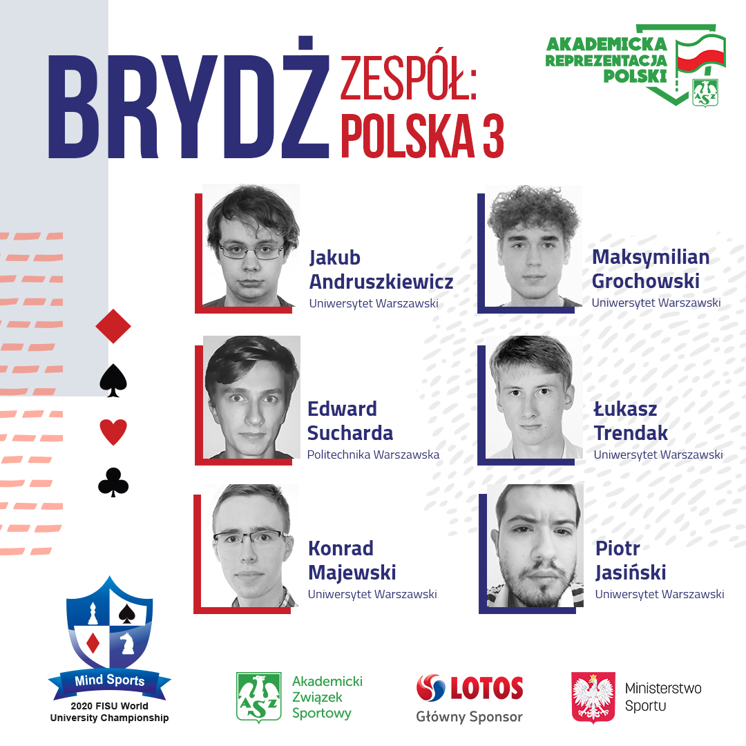 Również w zmaganiach brydżystów rywalizować będą czołowi zawodnicy świata. – Do faworytów należą też reprezentanci Polski, wicemistrzowie świata sprzed dwóch lat Jakub i Patryk Patreuha. Polacy właściwie z każdej akademickiej imprezy przywożą medale, więc mam nadzieję, że teraz będzie podobnie – mówi Stanisław Gołębiowski, który z ramienia komitetu organizacyjnego sprawuje pieczę nad turniejem w brydżu.