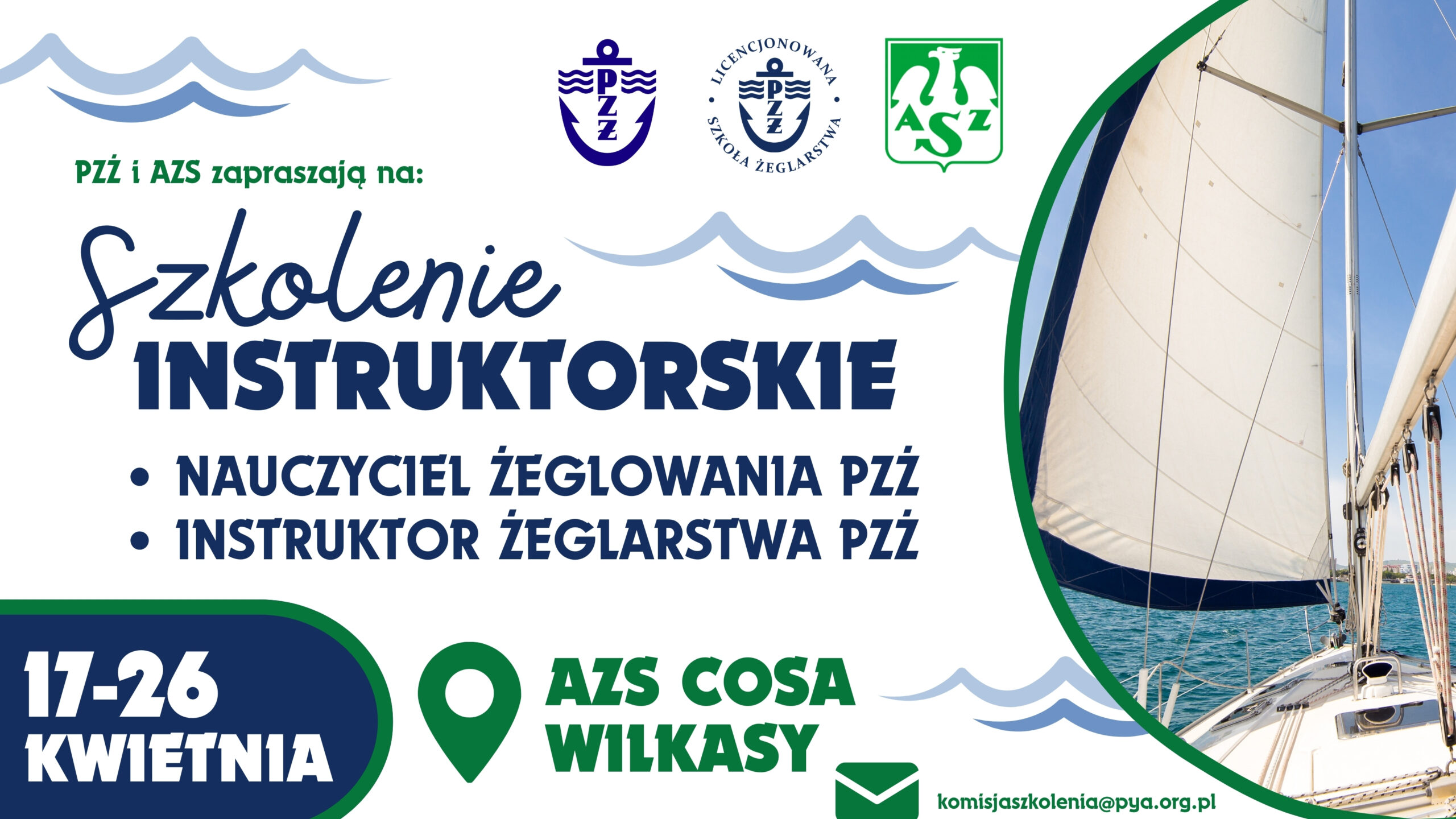 Komisja ds. sportu powszechnego i szkolenia Polskiego Związku Żeglarskiego i Akademicki Związek Sportowy zapraszają na szkolenia instruktorskie, które odbędą się w ośrodku Akademickiego Związku Sportowego w Wilkasach – Licencjonowanej Szkole Żeglarstwa PZŻ nr 5.